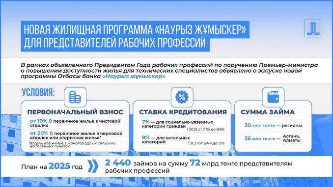 По поручению Премьер-министра Олжаса Бектенова для решения жилищного вопроса специалистов рабочих профессий объявлен запуск новой программы Отбасы банка «Наурыз жұмыскер».